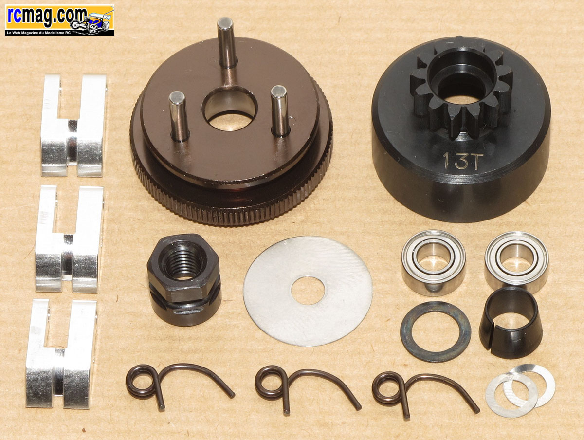 Le kit embrayage 3 points alu avec sa cloche de 13 dents.